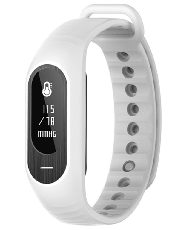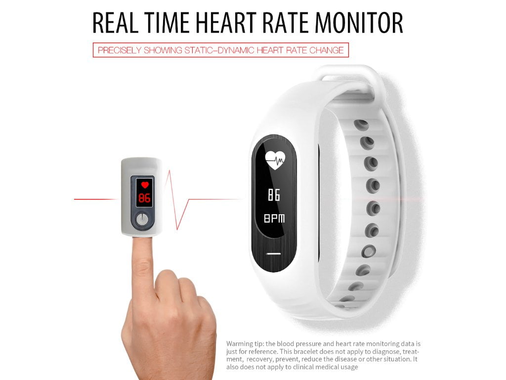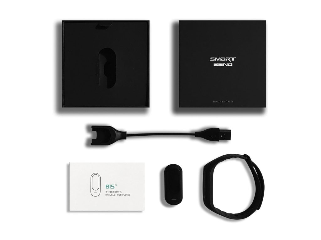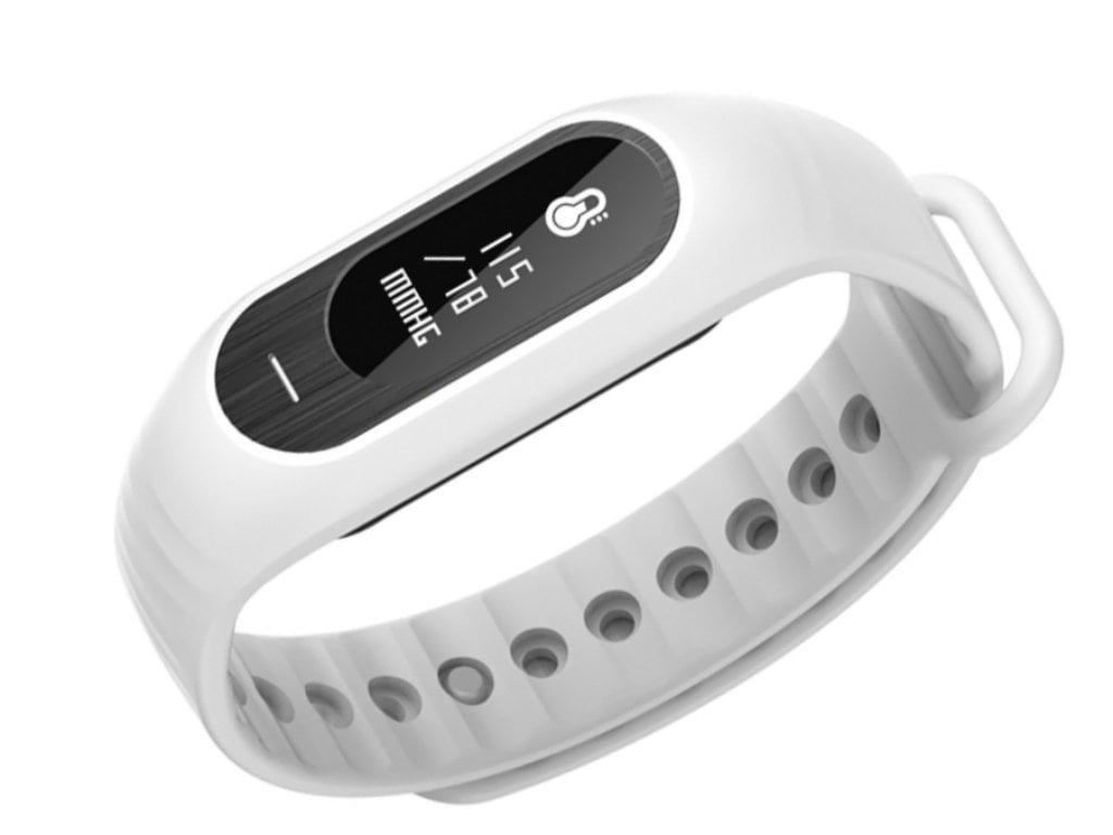 Sportowa opaska elektroniczna na gumowym pasku. W zestawie znajduje się kabel do ładowania wbudowanej baterii.